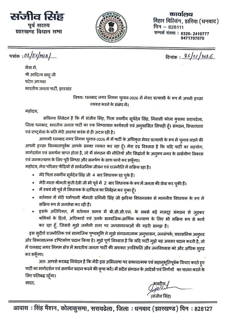 धनबाद : सिंह मेंशन एक बार फिर सुर्खियों में हैं। झारखंड विधानसभा के पूर्व सदस्य संजीव सिंह ने धनबाद नगर निगम चुनाव-2026 में मेयर प्रत्याशी बनने की इच्छा जाहिर की है। इस संबंध में उन्होंने भारतीय जनता पार्टी झारखंड के प्रदेश अध्यक्ष आदित्य साहू को पत्र लिखकर न केवल अपनी दावेदारी प्रस्तुत की है बल्कि खुद को भाजपा का निष्ठावान, अनुशासित और समर्पित सिपाही भी बताया है।