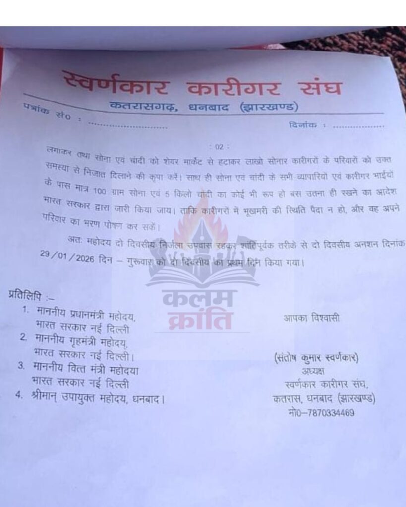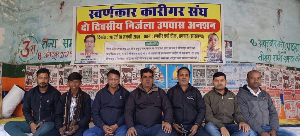 कतरास/धनबाद : गोल्ड कंट्रोल एक्ट लागू करने, एक्साइज ड्यूटी लगवाने, सोना चांदी को शेयर मार्केट से हटवाने तथा सोना एवं चांदी के सभी व्यापारियों एवं कारीगर भाइयों के पास मात्र 100 ग्राम सोना एवं 5 किलो चांदी रखने का आदेश भारत सरकार द्वारा जारी करवाने को लेकर स्वर्णकार कारीगर संघ के द्वारा धनबाद के रणधीर वर्मा चौक में दो दिवसीय निर्जला उपवास किया गया। स्वर्णकार संघ ने बताया कि गोल्ड कंट्रोल एक्ट एवं एक्साइज ड्यूटी है जाने के कारण अन्य राज्यों से अवैध तरीके से सोना एवं चांदी की बनी हुई जेवरात रेडीमेड आभूषण का आयात किया जा रहा है जिसके कारण गरीब कार्यक्रमों को सोना चांदी का काम नहीं मिल रहा है वर्तमान में स्थिति ऐसी हो चुकी है कि लाखों सोनार कारीगर के परिवारों की स्थिति भुखमरी के कगार पर पहुंच गई है। उन्होंने बताया कि अपनी मांगों को पत्र के माध्यम से प्रधानमंत्री, गृहमंत्री, वित्त मंत्री एवं धनबाद उपायुक्त को भी दिया है।