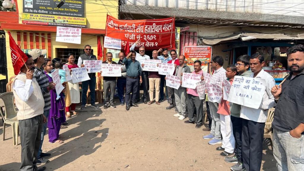धनबाद : श्रम एवं बीमा क्षेत्र में 100 प्रतिशत प्रत्यक्ष विदेशी निवेश (एफडीआई) और नई श्रम संहिताओं के विरोध में संपूर्ण भारत के मजदूर वर्ग 12 फरवरी 2026 को एक दिवसीय राष्ट्रव्यापी हड़ताल पर रहा। इस हड़ताल का आह्वान 10 केंद्रीय ट्रेड यूनियनों तथा विभिन्न क्षेत्रों के लाखों श्रमिकों का प्रतिनिधित्व करने वाले स्वतंत्र अखिल भारतीय संगठनों द्वारा किया गया था। देशभर के बीमा कर्मचारियों ने अपने अखिल भारतीय बीमा कर्मचारी संघ के आह्वान पर सक्रिय भागीदारी निभाई। हजारीबाग मंडल स्तर पर बीमा कर्मचारी संघ हजारीबाग मंडल के बैनर तले एलआईसी के सभी 37 कार्यालयों में पूर्ण तालाबंदी कर कामकाज ठप रखा गया। धनबाद जिले के सभी एलआईसी कार्यालयों में भी हड़ताल का व्यापक असर देखने को मिला।