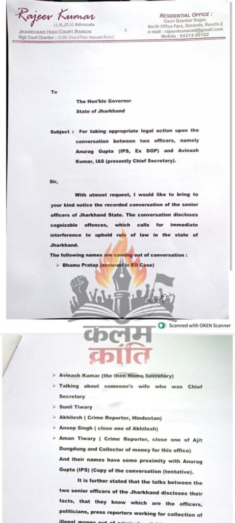 राँची : हाल ही में हुए राज्य के दो वरिष्ठ अफसरों की बातचीत का ऑडियो लीक का मामला तूल पकड़ता जा रहा है। इस प्रकरण में झारखण्ड हाई कोर्ट के जानेमाने वरिष्ठ अधिवक्ता राजीव कुमार ने राज्यपाल को पत्र लिख कर संज्ञान लेने की अपील की है। राजीव कुमार ने झारखण्ड के राज्यपाल को भेजे अपने पत्र की प्रतिलिपि को प्रधानमंत्री कार्यालय तथा गृहमंत्री को भी भेजा है। राजीव कुमार ने अपने पत्र में लिखा है कि-