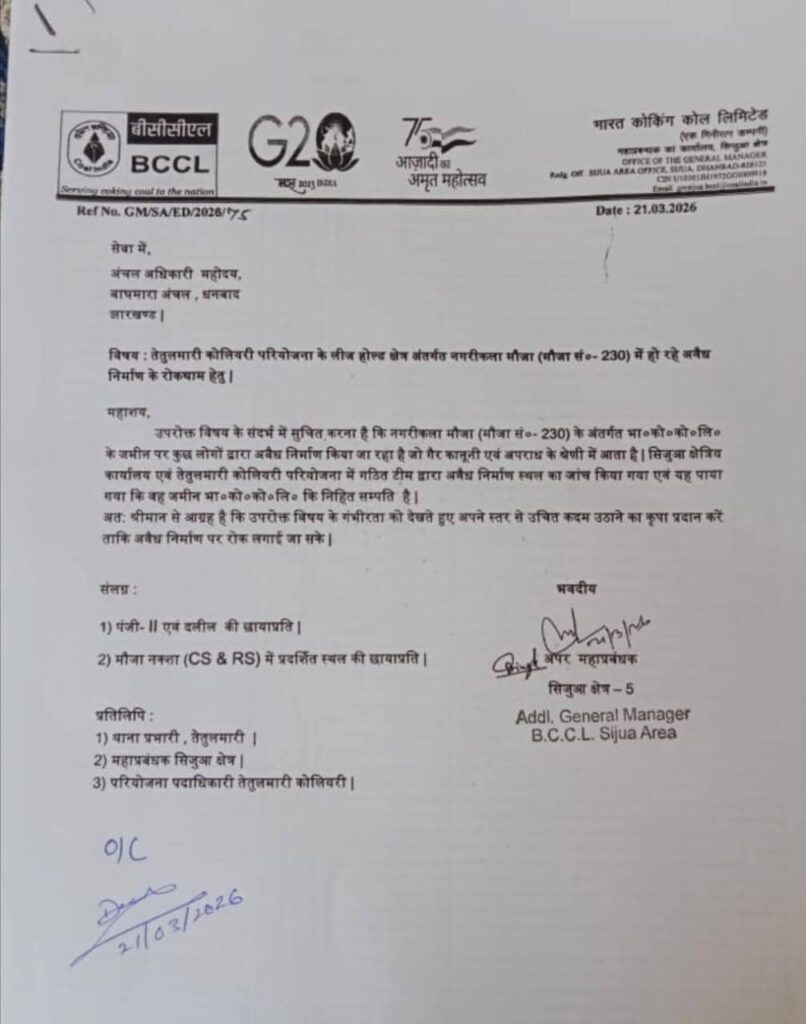 जांच के दौरान सिजुआ क्षेत्रीय कार्यालय और तेतुलमारी कोलियरी परियोजना की संयुक्त टीम ने पाया कि जिस जमीन पर निर्माण हो रहा है, वह बीसीसीएल की निहित संपत्ति है। प्रबंधन ने महाप्रबंधक के पत्र (पत्रांक GM/SA/ED/2026/75) के माध्यम से अधिकारियों को सूचित किया है कि संबंधित जमीन का रिकॉर्ड पंजी-II, दलील और मौजा नक्शा (CS एवं RS) में स्पष्ट रूप से दर्ज है। प्रबंधन ने इसे गैरकानूनी बताते हुए जल्द कार्रवाई की मांग की है, ताकि अवैध कब्जे और निर्माण को रोका जा सके।