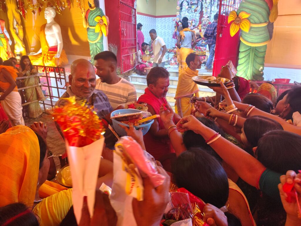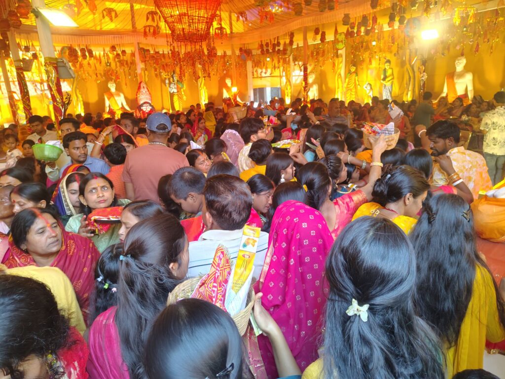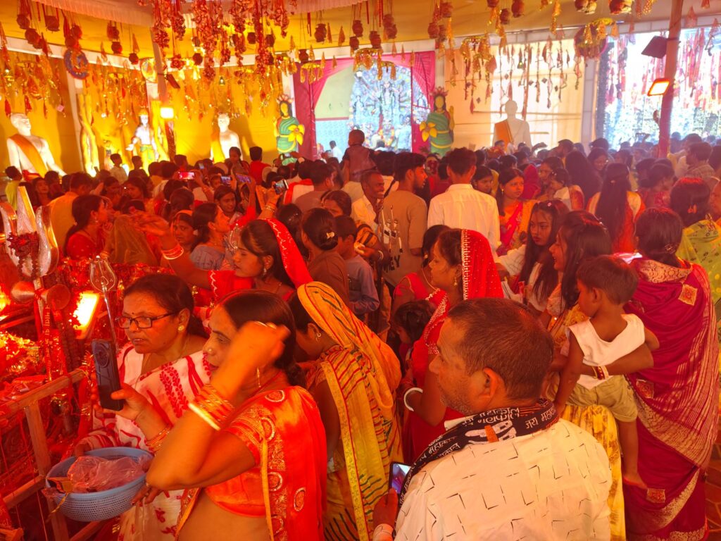 चारों ओर भक्ति गीत और आरती से पूरा माहौल भक्तिमय बन गया। संध्या में महाआरती एवं धुनुची नाच का आयोजन हुआ जिसे देखने के लिए भारी संख्या में श्रद्धालुओं की भीड़ जमी रही।