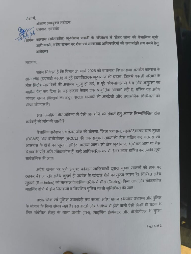 विशाल कुमार महतो ने पत्र के माध्यम से मांग करते हुए कहा है कि DGMS और BCCL की संयुक्त टीम बनाकर कतरास क्षेत्र का अविलंब ‘सुरक्षा ऑडिट’ किया जाए। जो क्षेत्र भूमिगत आग या धंसान के प्रति संवेदनशील हैं, उन्हें आधिकारिक रूप से ‘डेंजर जोन’ घोषित कर सूची सार्वजनिक की जाए। अवैध खनन पर रोक के लिए क्षेत्र में चल रहे अवैध मुहानों को वैज्ञानिक तरीके से (Dozing) सील किया जाए और संवेदनशील क्षेत्रों में ड्रोन एवं नियमित पुलिस गश्ती के जरिए निगरानी बढ़ाई जाए। अवैध खनन स्थानीय पुलिस और प्रशासन की जानकारी के बिना संभव नहीं है। अतः जिस थाना क्षेत्र में कोयला का अवैध खनन या भंडारण हो रहा हो उससे संबंधित थाना प्रभारी, माइनिंग इंस्पेक्टर और बीसीसीएल के सुरक्षा अधिकारियों पर कड़ी कानूनी कार्रवाई की जाए। डेंजर जोन में रहने वाले नागरिकों को एक निश्चित समय-सीमा के भीतर पक्के मकान और बुनियादी सुविधाओं के साथ सुरक्षित स्थानों पर स्थानांतरित किया जाए। उन्होंने चेतावनी देते हुए लिखा है कि यदि जल्द ही इन मांगों पर कार्रवाई नहीं हुई, तो वे जनता के साथ मिलकर आंदोलन का रास्ता अख्तियार करेंगे।