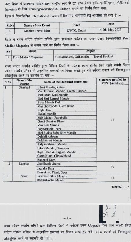 कतरास : राज्य पर्यटन संवर्धन समिति की एक बैठक रांची में आयोजित की गई। जिसमें विभिन्न मुद्दों और विषयों के साथ-साथ राज्य के विभिन्न पर्यटक क्षेत्र पर चर्चा की गई। इस सूची में धनबाद जिले के कुल 20 पर्यटक स्थलों को चिन्हित किया गया। चिन्हित किए गए पर्यटक स्थलों में लिलोरी मंदिर कतरास, मां देश वाली मंदिर कच्छी बलिहारी, मोहलबनी काली मंदिर, श्री श्री रामराज मंदिर, बिरसा मुंडा पार्क, मां झोरबुद्धि गर्म कुंड, रेजली डैम, शक्ति मंदिर, शिव मंदिर, पथरा कुल्ही, गौरी शंकर धाम, वन काली मंदिर, प्रियदर्शनी पार्क, श्री बुढ़ा बाबा शिव मंदिर, दलदली आश्रम, दुख हरनी मंदिर, कल्यानेश्वरी मंदिर, लिलोरी मंदिर गंगापुर, राजातालाब और राजा गढ़ मंदिर, गरम कुंड चरकखुर्द एवं भागुड़ी डैम है।