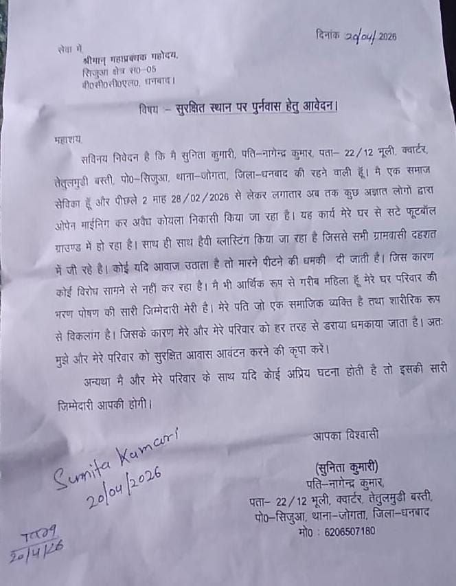 कतरास: धनबाद जिले के जोगता थाना अंतर्गत तेतुलमुड़ी बस्ती निवासी सुनीति कुमारी ने सिजुआ एरिया 5 के महाप्रबंधक को पत्र लिख कर बताया कि वो एक समाजसेविका है। समाज में हो रहे अनैतिक कार्यों का विरोध वो लगातार करते आई है। तथा इसके खिलाफ वे लगातार आवाज भी उठाती रही है। उन्होंने जीएम को दिए पत्र के माध्यम से बताया कि 22/12 भूली क्वार्टर तेतुलमुड़ी बस्ती के समीप पिछले दो महीना से कुछ अज्ञात लोगों द्वारा ओपन मीनिंग कर अवैध रूप से कोयला निकासी किया जा रहा है। यह कार्य मेरे घर से सटे फुटबॉल ग्राउंड में हो रहा है। साथ ही साथ हैवी ब्लास्टिंग भी किया जा रहा है। जिससे सभी ग्राम वासी दहशत में रह रहे हैं। यदि कोई आवाज उठाता है तो मारने पीटने की धमकी दी जाती है। जिसके कारण कोई भी विरोध करने की हिम्मत नहीं कर रहा है। मैं आर्थिक रूप से गरीब महिला हूं। मेरे पति शारीरिक रूप से विकलांग है। मुझे और मेरे परिवार को हर तरह से डराया धमकाया जा रहा है। उन्होंने महाप्रबंधक से सुरक्षित आवास आवंटन करने की मांग की तथा कहा कि मेरे एवं मेरे परिवार के साथ यदि कोई अप्रिय घटना घटती है तो इसकी जिम्मेवारी महाप्रबंधक की होगी।
