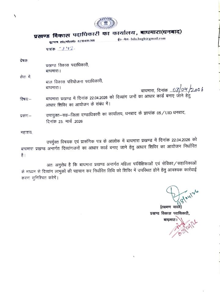 इस संबंध में प्रखंड विकास पदाधिकारी बाघमारा लक्ष्मण यादव ने बाल विकास परियोजना पदाधिकारी बाघमारा को पत्र जारी करते हुए बाघमारा प्रखंड अंतर्गत पर्यवेक्षिकाओं, सेविकाओं, सहायिकाओं के माध्यम से दिव्यांग लोगों की पहचान कर निर्धारित तिथि को शिविर में उपस्थित होने हेतु आवश्यक कार्रवाई करने का निर्देश दिया है।